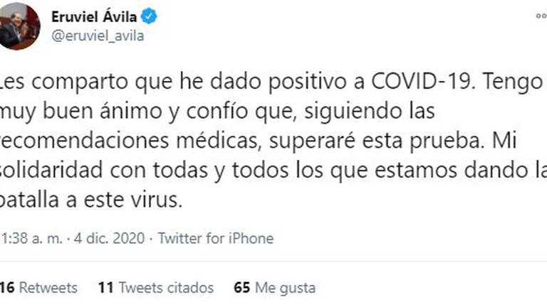 El ahora senador, hizo el anuncio a través de su cuenta de Twitter: “Les comparto que he dado positivo a COVID-19. Tengo muy buen ánimo y confío que, siguiendo las recomendaciones médicas, superaré esta prueba. Mi solidaridad con todas y todos los que estamos dando la batalla a este virus”, escribió.