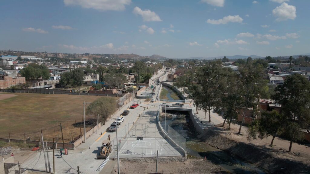 Las obras incluyen la construcción de un muro de mampostería en el canal para mitigar las inundaciones, andadores en el parque lineal, pavimento de empedrado zampeado, banquetas de concreto, rehabilitación de las líneas de agua potable e instalación de luminarias entre otras