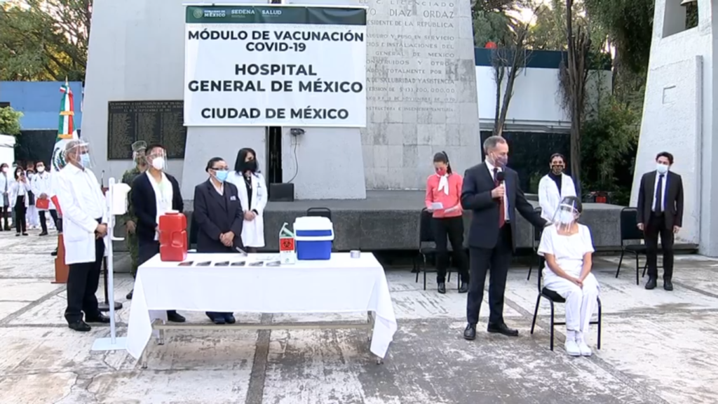 Desde el Hospital General de México, quien recibió la primera vacuna es María Irene Ramírez, de 59 años de edad, quien es jefa de enfermería en el Hospital Rubén Leñero.