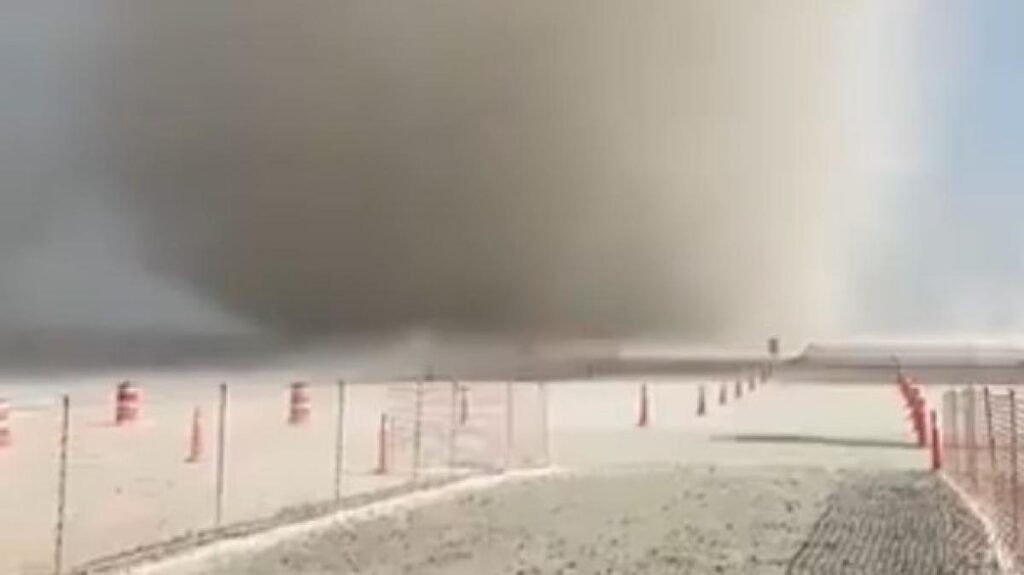La grabación dura 22 segundos y se observa cómo una lluvia de arena en forma de remolino invade las obras de la terminal aérea cuyas instalaciones de la Base Militar No.1 fueron inauguradas apenas el pasado 10 de febrero.