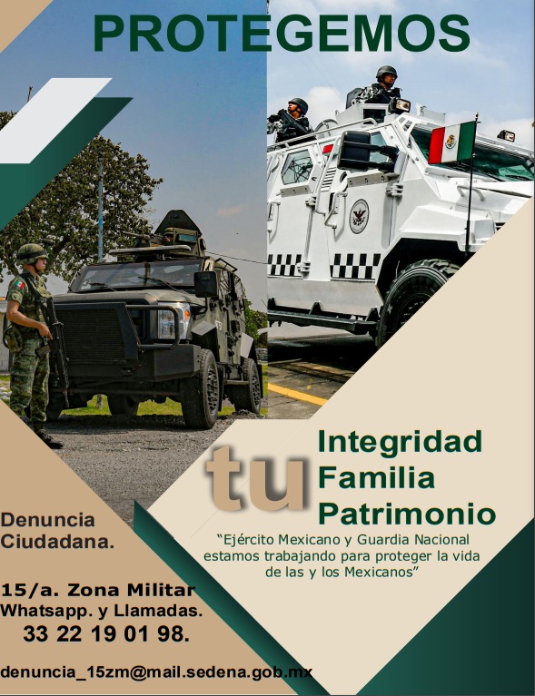 La Comandancia de la 15/a. Zona Militar invita a la población en general a participar en el Programa de Denuncia Ciudadana Anónima que coadyuve en los esfuerzos desplegados por el Ejército Mexicano en el Estado de Jalisco y el área metropolitana de Guadalajara para abatir los índices delictivos y favorecer mejores condiciones de paz y tranquilidad para la ciudadanía.