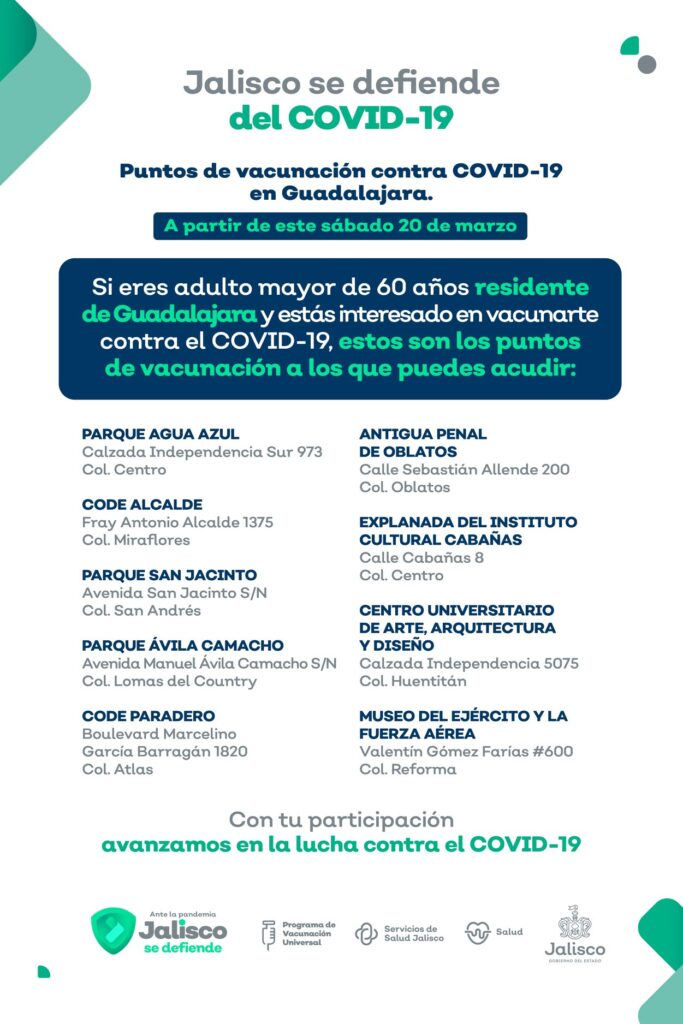 Este sábado 20 de marzo, comienza la vacunación contra Covid-19 para los adultos mayores en Guadalajara, según informó el gobernador, Enrique Alfaro, la inmunización comenzará desde las 8 am y hasta agotar las dosis.