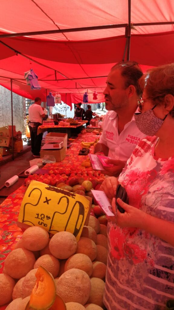 El candidato a la alcaldía de Guadalajara del partido federal Fuerza por México, Gustavo Flores, visitó a los tiangueros de Huentitán El Alto, a quienes escuchó para saber cuáles son sus inquietudes.