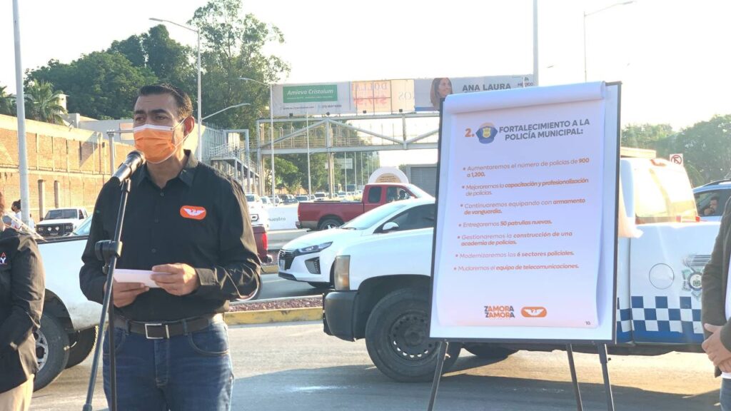 Presenta Salvador Zamora, candidato de Movimiento Ciudadano a la presidencia municipal de Tlajomulco, su estrategia de seguridad para los próximos tres años, en la que destacó el fortalecimiento de la policía y también de Protección Civil, además de combatir la violencia contra las mujeres con 300 pulsos de vida más.