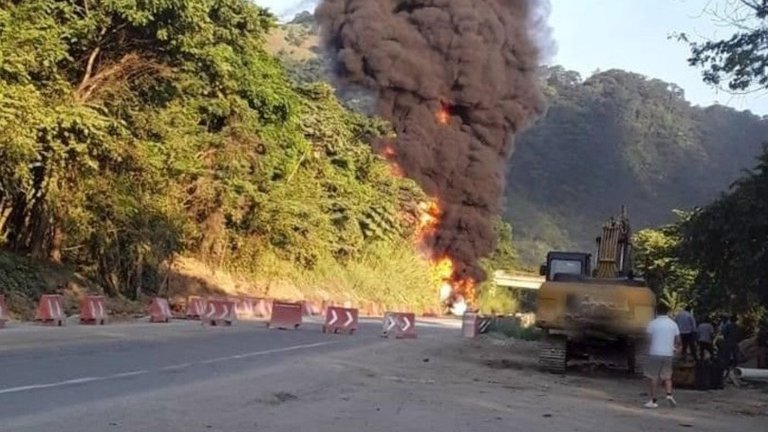 Una pipa que transportaba 20 mil litros de combustible se volteó en el kilómetro 153+000 de la carretera Las Choapas-Ocozocoautla provocando un aparatoso incendio, seguido de una explosión, cuya columna de humo, reportaron diversos medios, se visualizó desde kilómetros atrás.