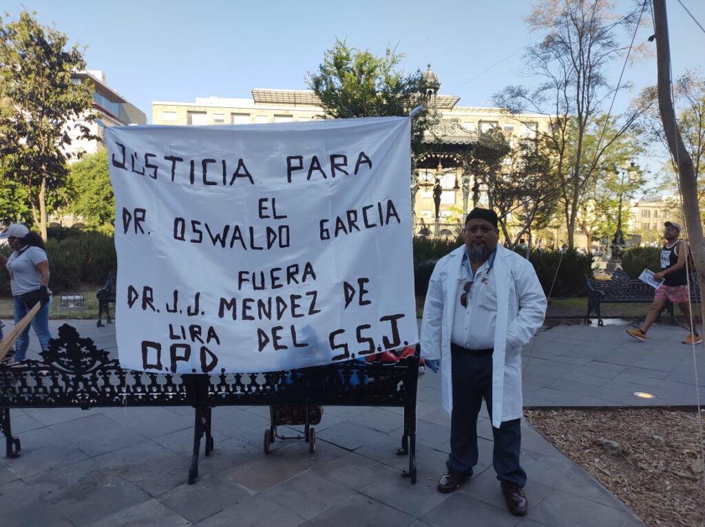 El doctor Oswaldo García Morales, estará ofreciendo consultas médicas frente a Palacio de Gobierno en el centro de Guadalajara, a manera de protesta, pues fue despedido injustificadamente de la Secretaría de Salud, donde duró laborando 19 años y 14 con base, lo que busca es que se le paguen sus prestaciones y salario, y que lo reinstalen de nuevo en su puesto.