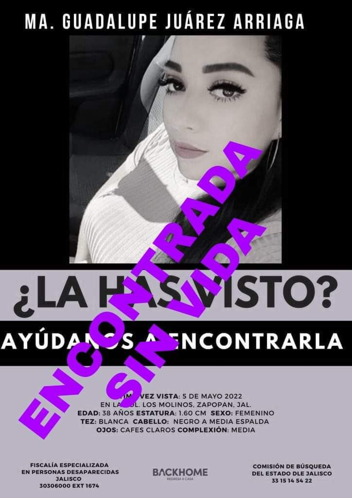 Fue localizada sin vida este fin de semana, María Guadalupe Juárez Arriaga, la mujer de 38 años de edad y de 1.60 de estatura, que desapareció el pasado 05 de mayo, en la colonia Los Molinos del municipio de Zapopan.
