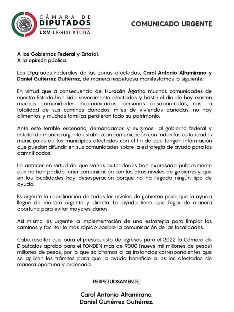 “A consecuencia del Huracán Agatha muchas comunidades de nuestro Estado han sido severamente afectados y hasta el día de hoy existen muchas comunidades incomunicadas, personas desaparecidas, casi la totalidad de sus caminos dañados, miles de viviendas dañadas, no hay alimentos y muchas familias perdieron su patrimonio”