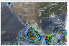 Golfo de México: Cielo nublado durante el día con lluvias puntuales fuertes en Tamaulipas, Veracruz y Tabasco; todas con descargas eléctricas. Ambiente matutino fresco a templado con bancos de niebla en zonas serranas de Veracruz. Cálido por la tarde y caluroso en zonas de Tamaulipas.