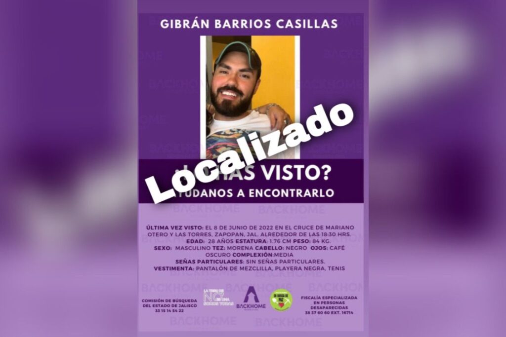 El Gobernador de Jalisco, Enrique Alfaro, confirmó la localización con vida y en buen estado de salud, del joven Gibrán Barrios Vasillas, reportado como desaparecido el 8 de junio,