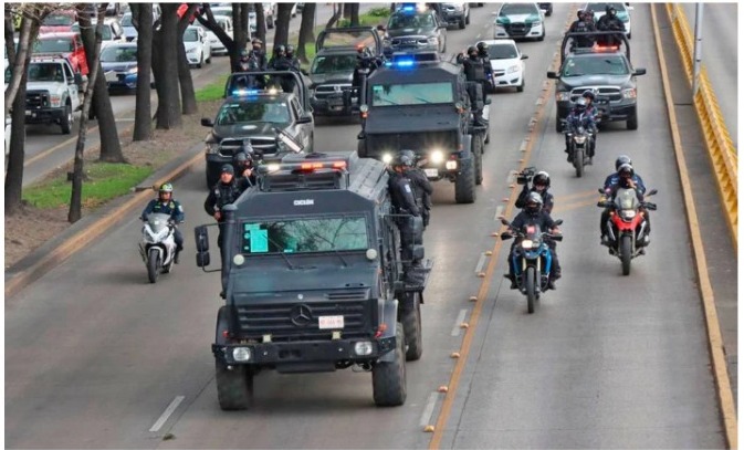 En cada camioneta que forman parte del convoy van cinco o seis elementos de seguridad protegiendo todos los flancos. Además, el “Rinoceronte” lleva en la parte trasera y prensados de una cuerda, cuatro policías armados. Esto demuestra el nivel de peligro que representan los hombres vinculados supuestamente a un cártel delictivo.