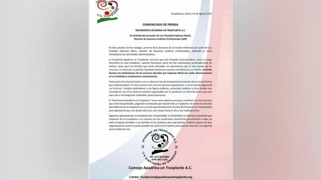 La Fundación Movimiento Apadrina un Trasplante A. C., a través de un comunicado, se deslindó de las acciones ejercidas por Luis Oswaldo Espinoza Marín, Director de Asesores Jurídicos Profesionales.