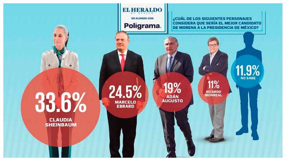 Según una encuesta la jefa de Gobierno de la Ciudad de México, Claudia Sheinbaum mantiene una ventaja como aspirante a la presidencia de México para 2024. La mandataria capitalina subió 3.2 puntos en febrero, teniendo como resultado 33.6 puntos porcentuales en la actual medición de los aspirantes del partido de Morena.