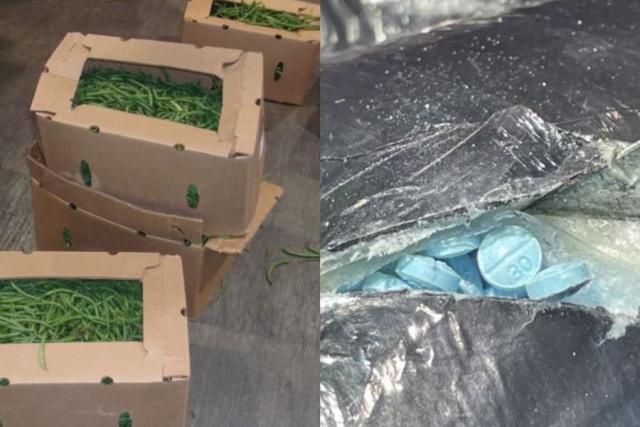 Oficiales de Aduanas y Protección Fronteriza encontraron un cargamento de 250 mil pastillas de fentanilo, ocultas en ejotes, el cual pretendían pasar de México a Estados Unidos.