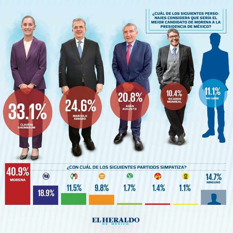 De acuerdo con la encuesta Poligrama, donde preguntaron ¿cuál de los siguientes personajes considera que sería el mejor candidato de Morena a la Presidencia de México?, Claudia Sheinbaum tuvo un apoyo del 33.1 por ciento, el canciller Marcelo Ebrard contó con el una aceptación del 24.6 por ciento, el secretario de Gobernación, Adán Augusto López Hernández, 20.8 por ciento y el senador Ricardo Monreal, 10.4 por ciento, mientras que el 11.1 por ciento de los encuestados no sabe por quién votaría.