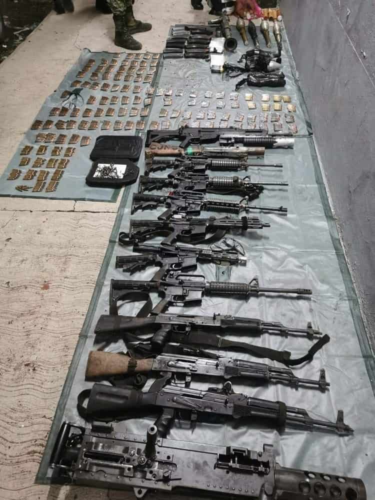 Entre las cosas que aseguraron cuatro armas largas y dos cortas, 14 granadas, un artefacto explosivo, 42 cargadores y mil 469 cartuchos de diferentes calibres.