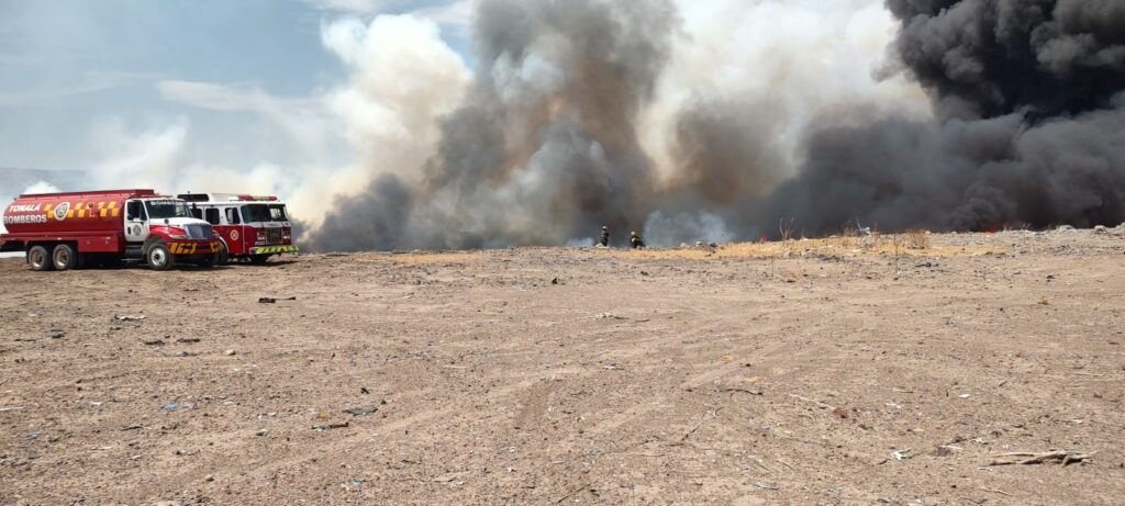 Este domingo cerca de la una de la tarde, Protección Civil de Tonalá recibió el reporte de un incendio en el vertedero Los Laureles el cual propagó rápidamente por lo que solicitaron apoyo a varias corporaciones, en total más de cien elementos estatales municipales y federales acudieron al llamado, por lo que también activaron la Alerta Atmosférica en los municipios del Salto, Juan Acatlán y Zapotlanejo, informó el director, Hugo Roldán.
