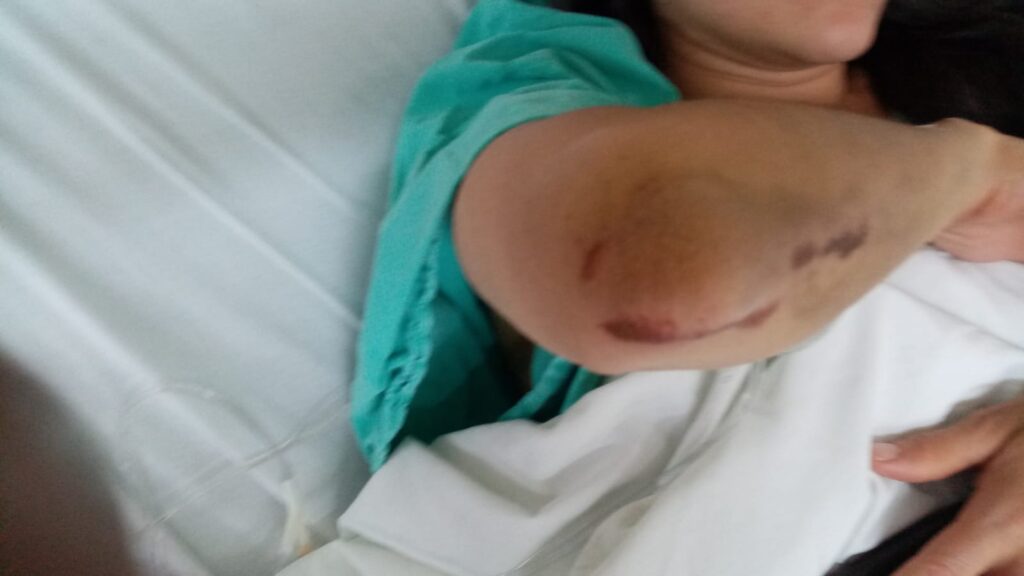 “A consecuencia se un cable que estaba tirado en la calle, que pertenece a TELMEX, pasa una camioneta lo jala y me lanza a mí contra la pared y caigo al suelo, de ahí algunas personas se acercan a ayudarme”.