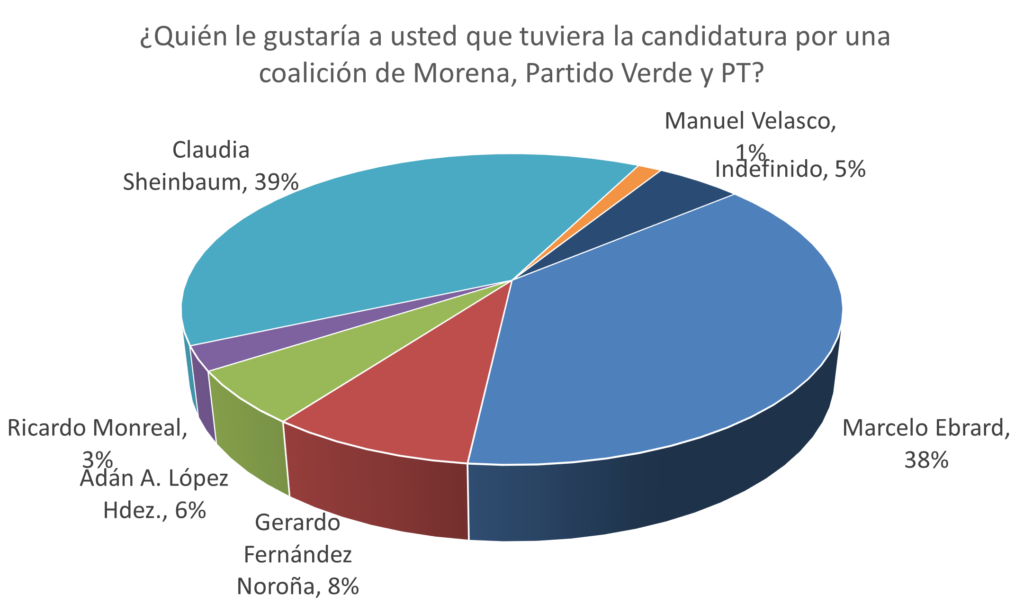 Según la última encuesta por GEA-ISA publicada este jueves, donde les preguntaron a mil personas sobre quién les gustaría como candidato por la coalición de Morena, Partido Verde y PT, la ex mandataria capitalina, Claudia Sheinbaum obtuvo el 39 por ciento de preferencias, seguido de Marcelo Ebrard, con 38 por ciento de aprobación.