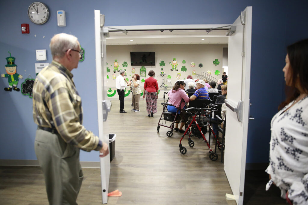 In this March 4, 2020, photo, seniors gather in an auditorium for morning announcements at Little Havana Activities and Nutrition Centers of Dade County, Inc., in Miami. The new coronavirus is posing a special challenge for nursing homes and other facilities that provide care for the elderly. (AP Photo/Brynn Anderson)