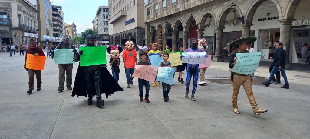 Con pancartas y al grito de queremos trabajar, artistas urbanos y botargas realizaron una manifestaron este jueves en el centro de Guadalajara, pues argumentan que el ayuntamiento tapatío les pide vestirse de personajes históricos y dejar de lado a superhéroes y personajes ficticios, informó el manifestantes, Alejandro.
