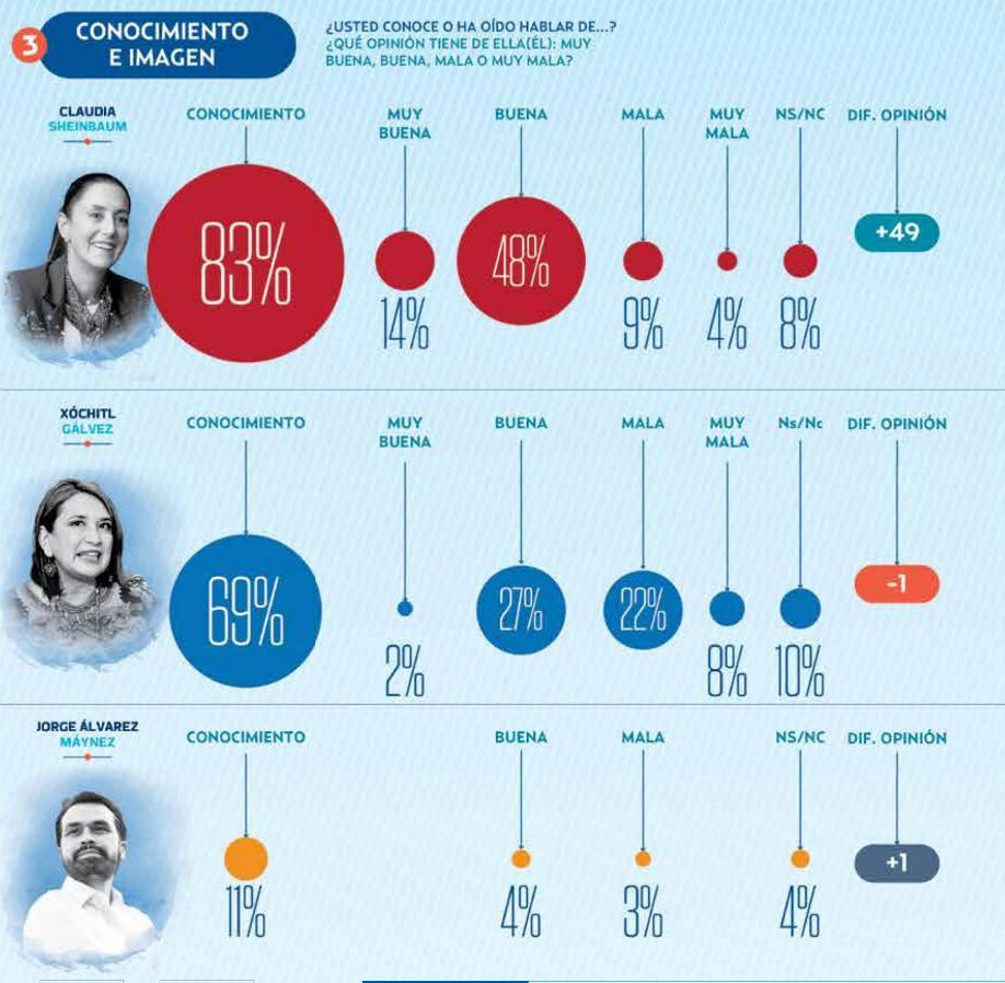 Según una encuesta, la opinión ciudadana sobre la precandidata única de Morena-PT-PVEM, a la Presidencia de la República, Claudia Sheinbaum indicó que continúa en primer lugar de las preferencias electorales, en comparación a la aspirante por el PAN- PRI-PRD, Xóchitl Gálvez y el de Movimiento Ciudadano, Jorge Álvarez Máynez.