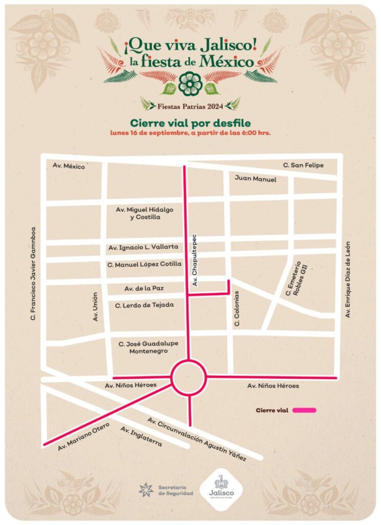 Para garantizar la seguridad de quienes asistan a las actividades programadas para los festejos patrios de este año, la Secretaría de Seguridad del Estado (SSE), a través de la Comisaría de la Policía Vial, mantendrá labores preventivas y llevará a cabo el cierre de vialidades los días 15 y 16 de septiembre en diferente locaciones del municipio de Guadalajara.