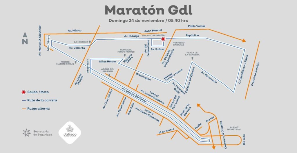 El punto de salida para el maratón será por el Andador Fray Antonio Alcalde, entre las calles Pedro Moreno y Morelos, a un costado de la Catedral Metropolitana, por lo que los cierres viales en la zona comenzarán a partir de las 05:40 horas del próximo domingo.