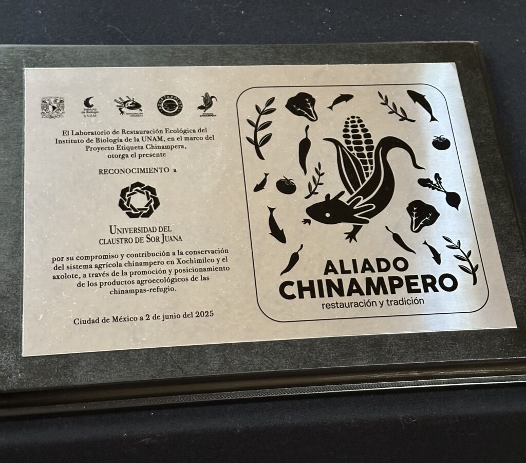 Por su compromiso y contribución a la conservación del sistema agrícola chinampero en Xochimilco y del ajolote, a través de la promoción y posicionamiento de los productos agroecológicos de las chinampas- refugio, el Laboratorio de Restauración Ecológica del Instituto de Biología de la UNAM entregó un reconocimiento a la Universidad del Claustro de Sor Juana (UCSJ).