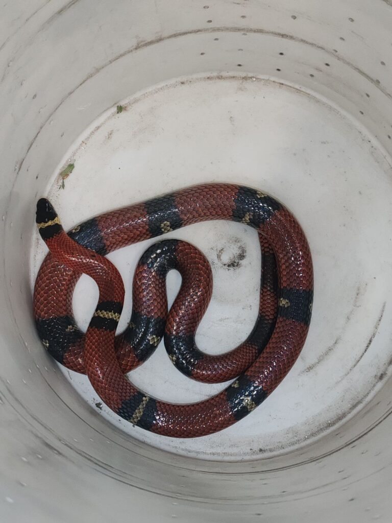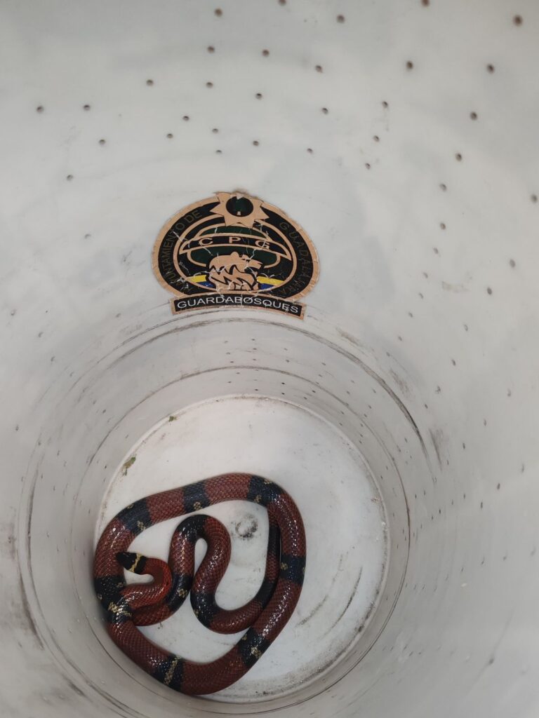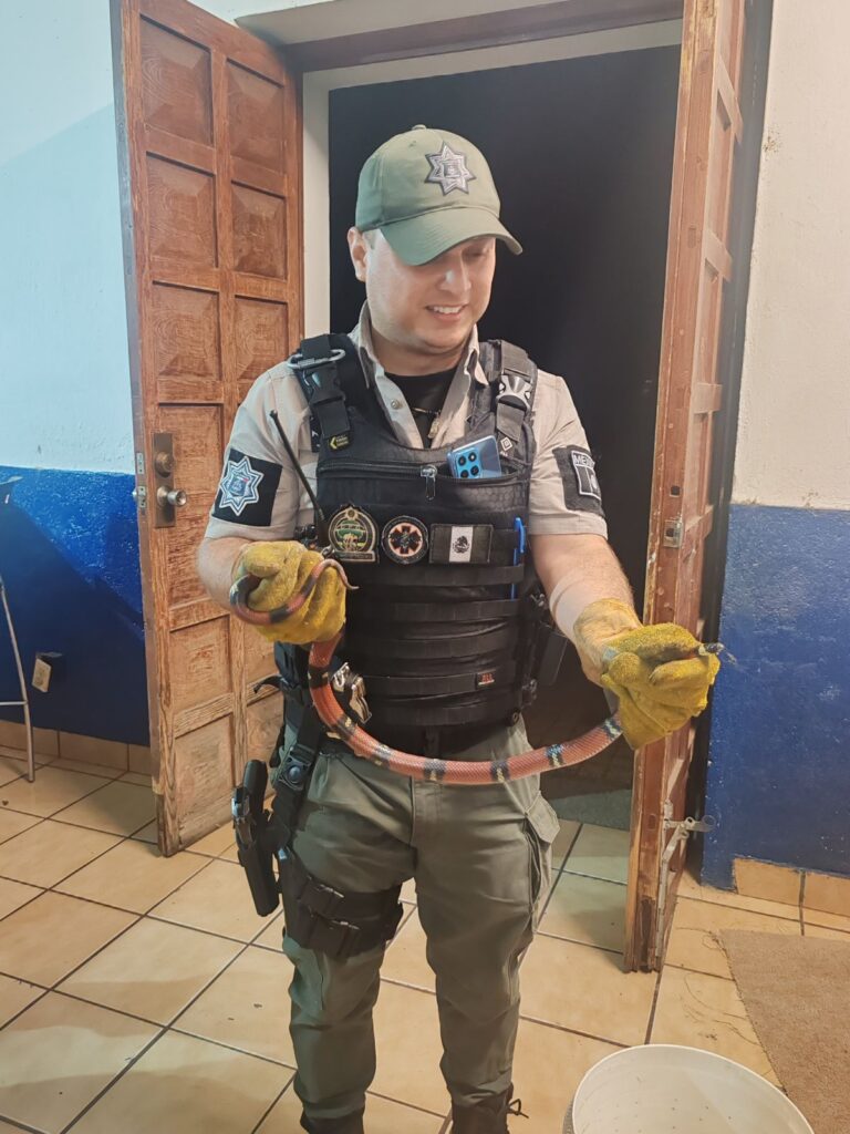 Los elementos aseguraron a la serpiente falso coralillo de aproximadamente 1.20 metros de longitud, la cual estaba en aparente buen estado de salud.