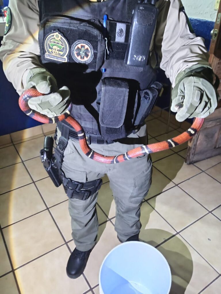 Oficiales de Guardabosques de la Comisaría de Seguridad Ciudadana de Guadalajara aseguraron a una serpiente falso coralillo que estaba al interior de un domicilio, en la Colonia Progreso.