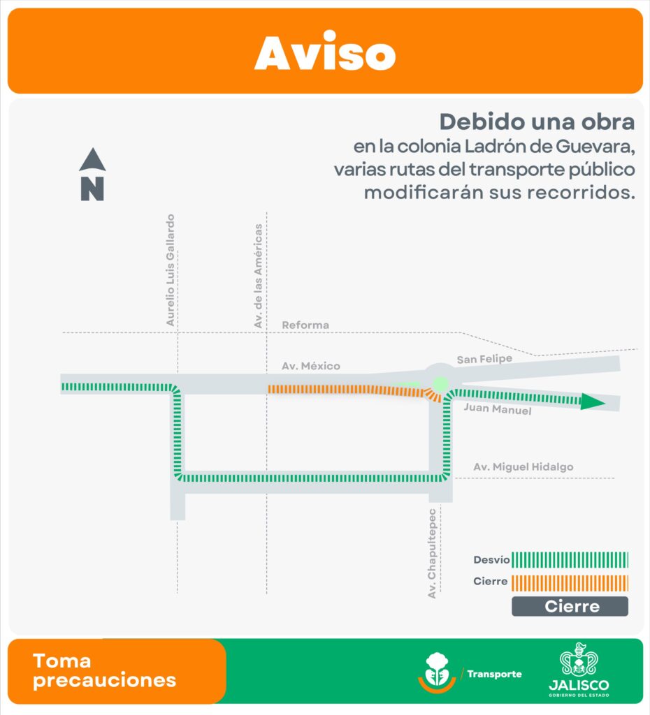 | La Secretaría de Transporte (SETRAN), informa que a partir de este lunes 28 de julio, y por el tiempo que duren las obras de rehabilitación en Plaza de la República, se realizarán ajustes temporales en tres rutas del servicio de transporte público en Guadalajara debido a cierres viales.Como parte de la primera etapa de la obra las unidades del transporte público que circulan por avenida México, rumbo al centro de la ciudad en sentido poniente-oriente, modificarán su recorrido temporalmente entre Américas y Chapultepec.Durante el periodo de desvío las rutas C01 (antes 39A), C119 (antes 360) y C123 (antes 258) modificarán su recorrido, únicamente en sentido hacia el centro de Guadalajara.Tendrán paradas temporales en los cruces de avenida México y Luis Pérez Verdía; Aurelio L. Gallardo y Justo Sierra; avenida Chapultepec y Justo Sierra y, finalmente, en Juan Manuel y José Clemente Orozco.Durante el desvío estas rutas no realizarán ascensos ni descensos en las paradas oficiales ubicadas sobre avenida Hidalgo, las cuales son utilizadas por las rutas Sitren L3 y L1, además de la V02 de la Ruta López Mateos.Para apoyar en la circulación y orientar a quienes transiten por la zona, elementos de la Policía Vial mantendrán presencia constante en la zona.Se invita a la ciudadanía a mantenerse informada a través de las redes sociales de la Secretaría de Transporte, en Facebook como @SecretariadeTransporteJal y en X como @TransporteJal, para conocer más sobre estos y otros desvíos.Para saber más:La ruta alterna que tomarán las unidades del transporte público será la siguiente:● A partir de avenida México en su cruce con Aurelio L. Gallardo, donde girarán a la derecha hasta avenida Hidalgo. Continuarán derecho hasta avenida Chapultepec, en donde girarán a la izquierda hasta el entronque con la av. México / calle Juan Manuel, para incorporarse a su recorrido habitual.● En sentido contrario, de oriente a poniente, las rutas no tendrán modificaciones, circularán de forma regular por la calle San Felipe / av. México. |