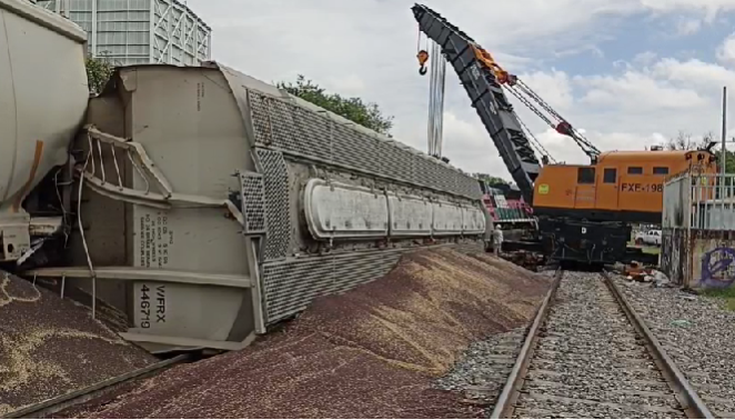 Tlaquepaque, Jalisco.- Tres vagones y la locomotora se salieron de las v铆as en avenida Juan de la Barrera y Prolongaci贸n Gobernador Curiel, transportaba semillas de canola. Personal de Ferromex fueron quienes detectaron el descarrilamiento por lo que se trasladaron al punto para maniobras聽