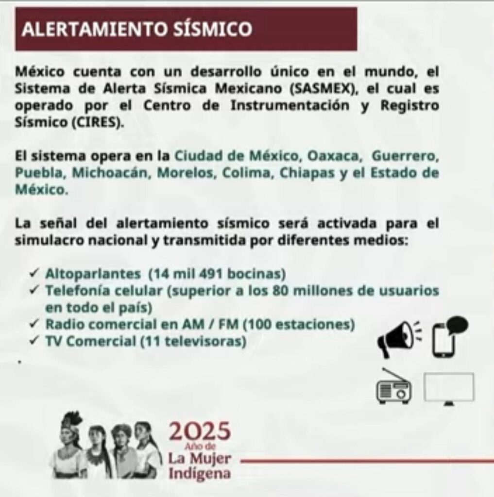 Ciudad de México.- Durante la conferencia “mañanera del pueblo” de la presidenta Claudia Sheinbaum, Laura Velázquez Alzúa, coordinadora Nacional de Protección Civil señala que está todo listo para el segundo Simulacro Nacional y recordó que, se efectuará el próximo viernes 19 de septiembre a las 12 del día hora del centro del país y en el que sonarán en 100 estaciones de Radio, 11 televisoras, 14 mil 900 altavoces y en 80 millones de equipos de telefonía celular. Con ello, México se sumará a EU, Canadá y Chile donde se tiene implementado.