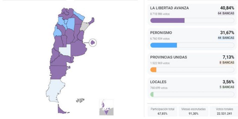 Con más del 90 por ciento de los votos escrutados, la fuerza oficialista obtuvo el 40.8% de los sufragios, frente al 24.5% de la alianza de centroizquierda Fuerza Patria.