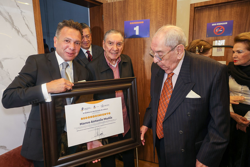 Durante la ceremonia, Pablo Lemus Navarro, Gobernador de Jalisco, entregó un reconocimiento a Marco Antonio Muñiz, quien, a sus 92 años, continúa como un símbolo de identidad y orgullo jalisciense.