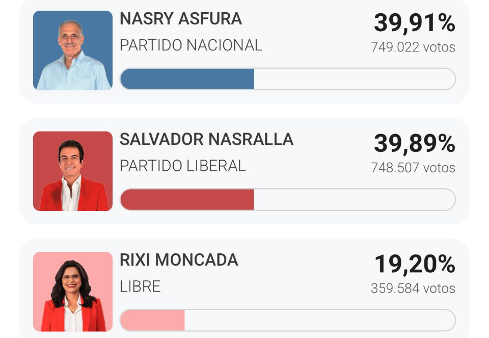 Con 57% de las actas procesadas, el país se encuentra en un empate técnico entre los opositores Nasry Asfura y Salvador Nasralla, separados por apenas 515 votos. Asfura suma 39.91% y Nasralla 39.89%. Muy atrás, con 19.16%, se ubica la candidata oficialista Rixi Moncada, del partido Libre.
