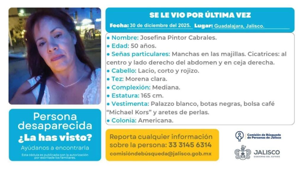 Guadalajara, Jalisco.- La vice Fiscalia especial en personas desaparecidas llevó a cabo una diligencia en viviendas que se encuentran en los cruces de la calle penitenciaría y Pedro Moreno en la colonia americana. Debido a que en esa zona fue vista por última vez el pasado 30 de diciembre Josefina pintor Cabrales de 50 años. Así lo confirmó Blanca Trujillo vice fiscal de personas desaparecidas.