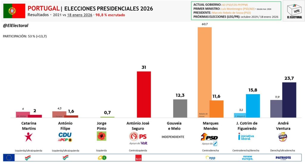 De acuerdo con los resultados casi definitivos, el socialista António José Seguro, de 63 años, fue el más votado con 31 por ciento, seguido del líder del partido ultraderechista Chega, André Ventura, quien obtuvo 23.5 por ciento.