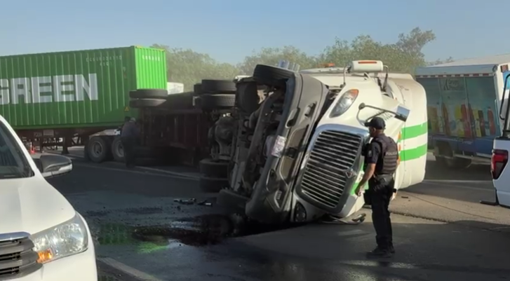 Tlajomulco de Zúñiga, Jalisco.- Un tráiler volcó en los cruces de carretera a chapala y carretera a El Salto. Aparentemente las toneladas de Fayuca que transportaba provocaron el accidente. Elementoz de protección civil y Bomberos de Tlajomulco de Zúñiga acudieron al lugar para llevar a cabo los trabajos de saneamiento debido a una gran derrama de aceite., en la voz el bombero Edgar García.