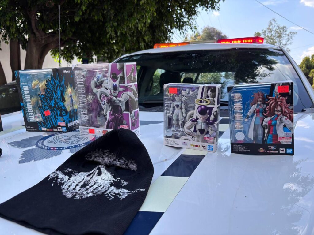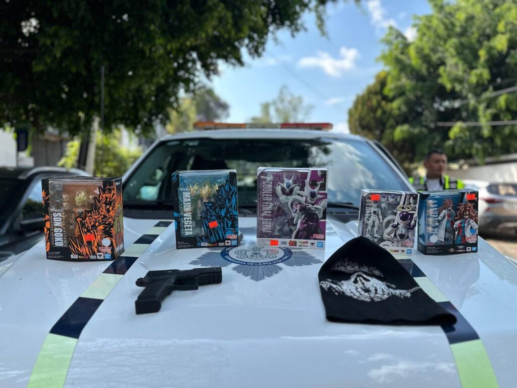 Tras una inspección, al sujeto le localizaron una pistola de utilería, así como cinco cajas de figuras de acción de Dragon Ball, entre ellas Goku, con un valor aproximado de 20 mil pesos y un pasamontañas.