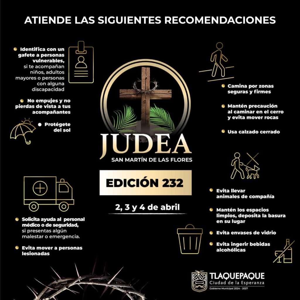 Tlaquepaque, Jalisco.- Con una afluencia estimada superior a 250 mil personas, los días 2, 3 y 4 de abril se llevará a cabo la edición 232 de la tradicional Judea en San Martín de las Flores, Tlaquepaque, uno de los eventos culturales y religiosos más representativos del municipio.