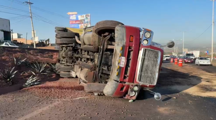 El Salto, Jalisco.- Un tráiler sobre los cruces de nuevo periférico y carretera al castillo en el municipio de El Salto. El chofer perdió el control y terminó con el aparatoso accidente. Personal de protección civil y bomberos del municipio arribaron, Leopoldo Padilla.